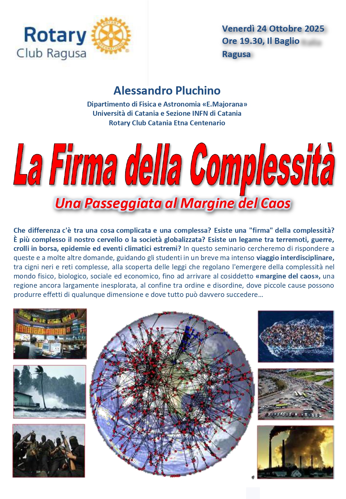 Venerdì 24 Ottobre 2025, presso il ristorante “Il Baglio” in Via G.A. Cartia, caminetto: “La firma della complessità – Una passeggiata al Margine del Caos”, con il Prof. Alessandro Pluchino, che insegna Fisica Teorica presso il Dipartimento di Fisica e Astronomia “E. Majorana” dell’Università degli Studi di Catania ed è responsabile di ricerca presso l’Istituto Nazionale di Fisica Nucleare.